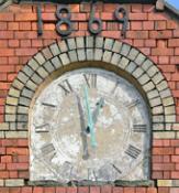 The former prison clock on the warehouse in Queen Street, bordered by decorative yellow brickwork.